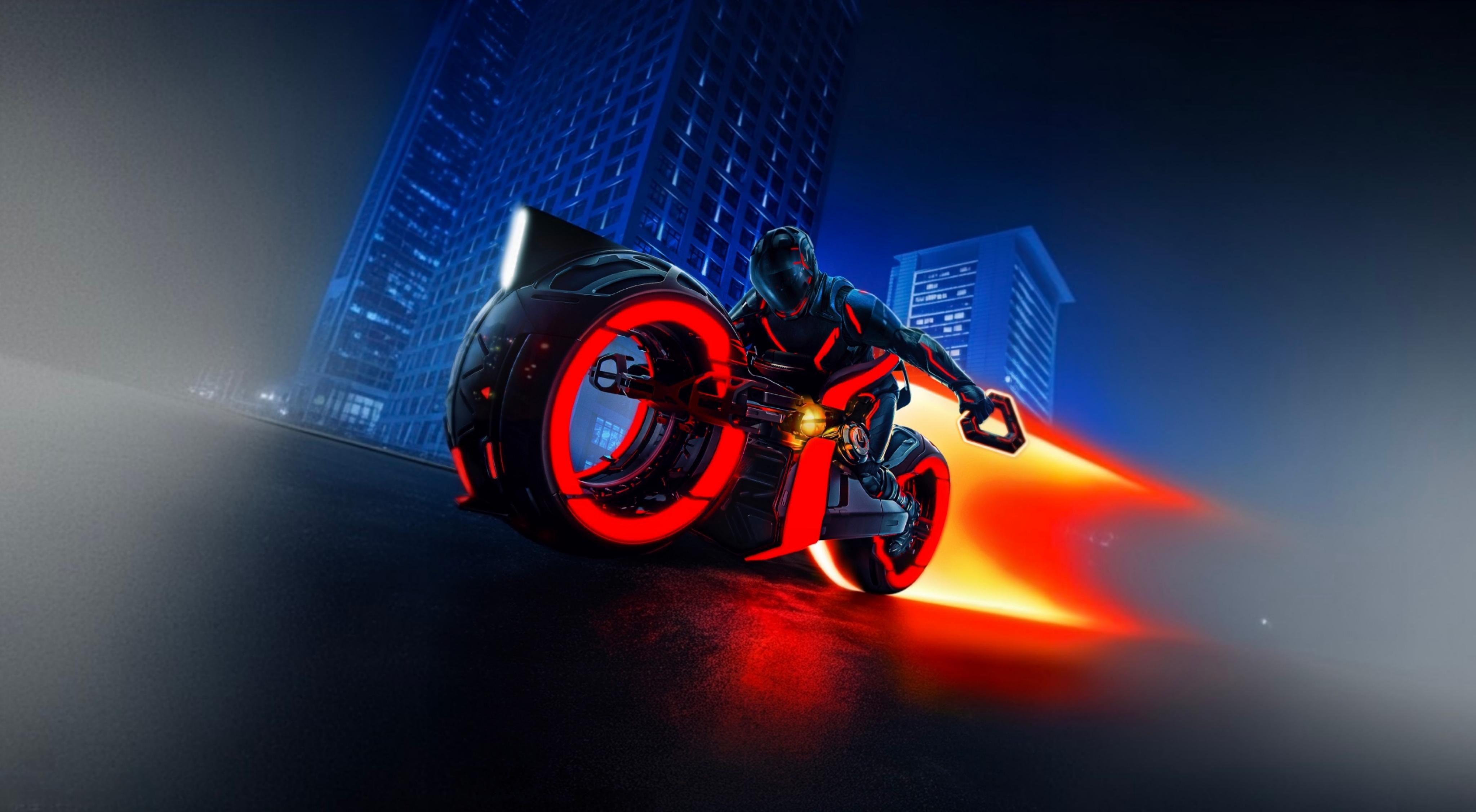 Eve and Seth return to the city and split up while Ares and Athena go after her. Eve, carrying a hard drive with the code, is chased on her motorcycle through the streets while the programs use their Light Cycles and cause damage. Eve manages to knock Athena out in a parking garage and steals her Light Cycle. Ares chases her until they both crash. Eve makes it to the end of a dock where she discovers what Ares really is, and he and Athena de-rezz since their time is up. Eve throws the drive into the river and is taken by a Dillinger aircraft.